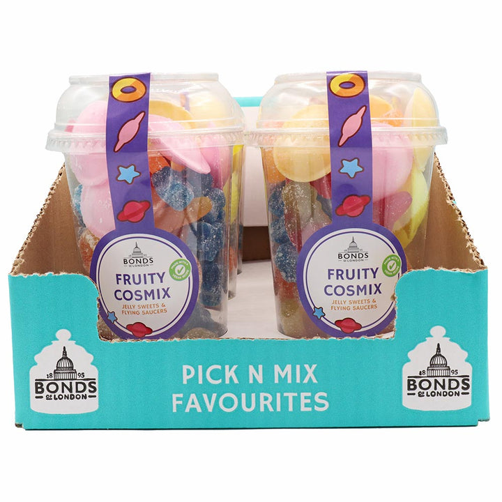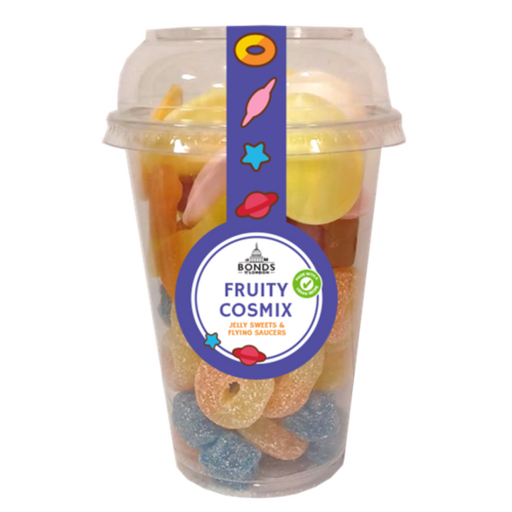 This Bonds Cosmix candy cup is out-of-this-world. Enjoy a cosmic mix of delicious sweet treats, including fizzy peach rings, fizzy stars, fruity space mix gummies and the classic space treats - flying saucers. This "cosmix" of flavour and fun is the ideal new addition to your candy cup displays and perfect for enhancing your pick-and-mix selection, drawing in customers with its space theme and exciting mix.