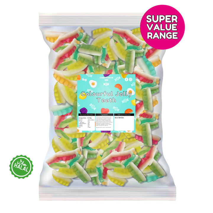 An assortment of fruit-flavoured jelly sweets in the shape of teeth. 1kg. Halal suitable.