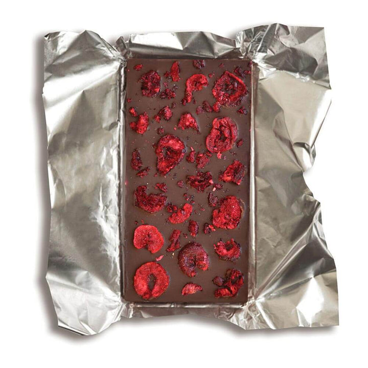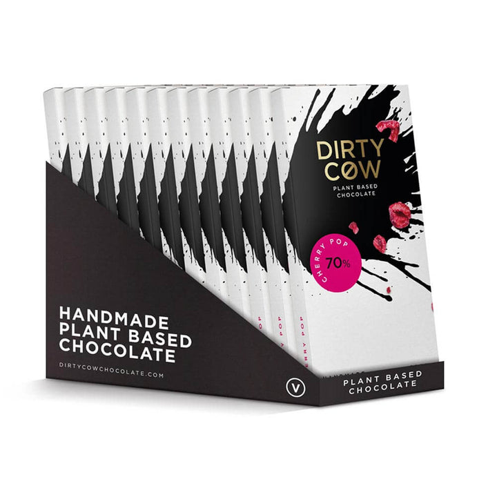 Once you cherry pop, you just can't stop! The Dirty Cow Cherry Pop Chocolate Bar is a deliciously dark dairy free chocolate, scattered with sweet cherries. Each bar is handmade with individual ingredients dunked, placed, and sometimes thrown onto a creamy chocolate bar. Dirty Cow chocolate is animal and dairy free with all cocoa sourced from certified sustainable farming. And if that isn’t enough, all packaging is 100% recyclable.