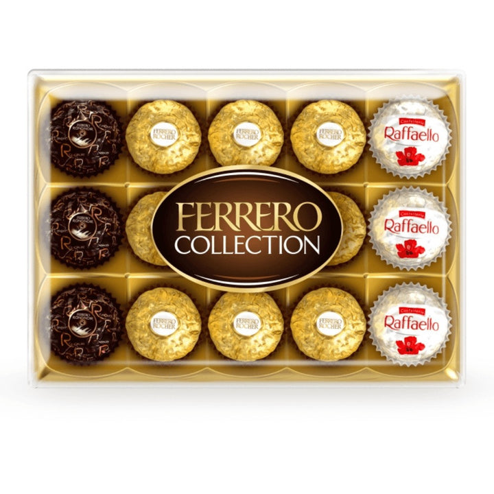 Delicious in different ways, discover Ferrero Collection with the unique Ferrero Rocher, the velvety coconut Raffaello, and the seductively dark Rondnoir. With many years experience of producing fine Italian delicacies, Ferrero now offers you a new unique assortment of irresistible specialities. Ferrero Collection: The perfect gift for the ones you love. A collection of three Ferrero delicacies: Ferrero Rocher, Raffaello and Rondnoir.
