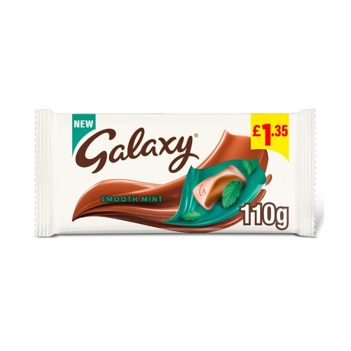 Enjoy a bar of Galaxy chocolate with a mint twist. Smooth and creamy Galaxy chocolate with natural mint flavour, made with 100% responsibly sourced cocoa, in a shareable 110g bar. Choose Pleasure Galaxy, and choose these £1.35 price-marked bars to offer your customers excellent value on this indulgent chocolate bar. Ensure these bars of Galaxy Mint chocolate are displayed within a prominent position within your price-marked and chocolate bar range.