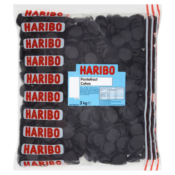 Haribo Pontefract Cakes are a popular retro sweet. Round liquorice flavoured jellies that are black in colour. They are packed in a 3kg bulk bag to give you total flexibility on how to retail them.