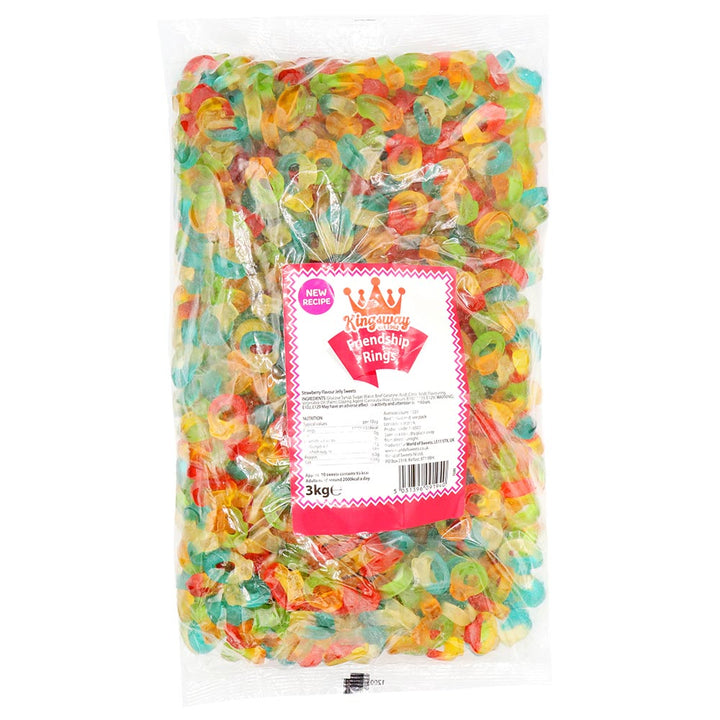 Kingsway Friendship Rings bring fun to any pick and mix station. Multicoloured ring-shaped jelly sweets bursting with a delicious fruit flavour, packed into a 3kg bulk bag, making them ideal for refilling your pick-n-mix bins. Kingsway Friendship Rings are perfect for sharing with friends and family to celebrate your bond—or simply as a sweet treat for yourself! Take your pick 'n' mix selection to the next level with Kingsway! From retro classics to innovative new flavours, Kingsway provides the perfect way to create your ultimate sweet range. Don’t miss the Kingsway Pick 'n' Mix Deal to mix, match, and save, or explore the Kingsway Mega Value range for unbeatable prices. Stock up today and expand your product offering with Kingsway.