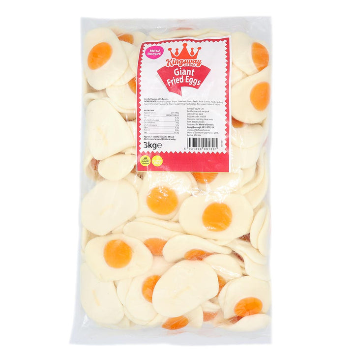 A pick-n-mix favourite that's giant in size. Kingsway Giant Fried Eggs have a vanilla flavour, soft jelly texture and the traditional yellow yolk in the middle. Made with no artificial colours and flavours, gluten-free and packed into a 3kg bulk bag, these Giant Fried Eggs will be a welcome addition to your pick and mix range. In fact, no pick and mix range is complete without Fried Eggs! Take your pick 'n' mix selection to the next level with Kingsway! From retro classics to innovative new flavours, Kingsway provides the perfect way to create your ultimate sweet range. Don’t miss the Kingsway Pick 'n' Mix Deal to mix, match, and save, or explore the Kingsway Mega Value range for unbeatable prices. Stock up today and expand your product offering with Kingsway.