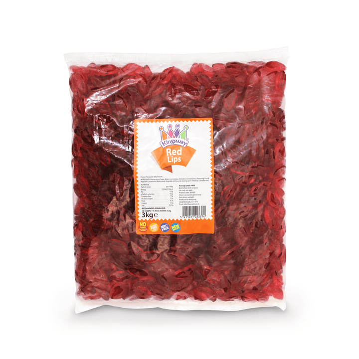 Kingsway Juicy Red Lips are delicious cherry flavoured jelly lips, made with no artificial colours or flavours! Cherry Lips have always been a popular pick 'n' mix sweet and these gluten and dairy free sweets will make a great addition to your range. Packed in a bulk 3kg bag, containing approximately 1000 pieces, these juicy sweets are perfect to add to your pick & mix display or to sell from a jar. Take your pick 'n' mix selection to the next level with Kingsway! From retro classics to innovative new flavours, Kingsway provides the perfect way to create your ultimate sweet range. Don’t miss the Kingsway Pick 'n' Mix Deal to mix, match, and save, or explore the Kingsway Mega Value range for unbeatable prices. Stock up today and expand your product offering with Kingsway.