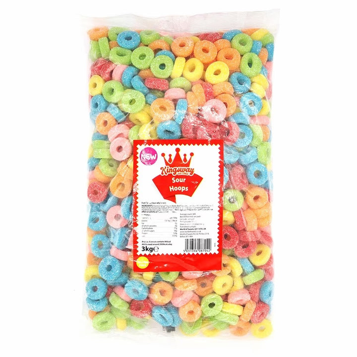 Your customers will be jumping through hoops to try the delicious fruity flavour of Kingsway Sour Hoops. Multicoloured fruit flavoured hoop-shaped jelly sweets coating sour sugar, packed into a 3kg bulk bag. The perfect new addition to your pick and mix selection, and ideal for adding to clear bags and cones for party favours and gifts. Additionally, these sour sweets are gluten-free. Take your pick 'n' mix selection to the next level with Kingsway! From retro classics to innovative new flavours, Kingsway provides the perfect way to create your ultimate sweet range. Don’t miss the Kingsway Pick 'n' Mix Deal to mix, match, and save, or explore the Kingsway Mega Value range for unbeatable prices. Stock up today and expand your product offering with Kingsway.