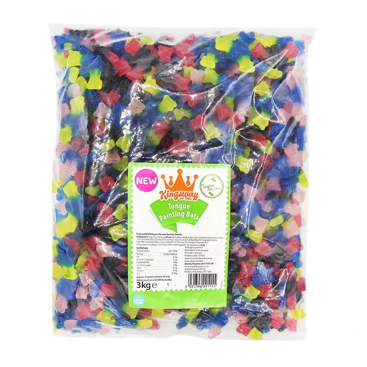 Kingsway Tongue Painters Bats are the perfect way to make your pick n mix selection even more spooktacular! Gummy treats with juicy fruit and sweet bubblegum flavours that turn paint your tongue different colours. Loved by both children and adults, these playful treats are a perfect addition to any pick n mix stand. Your customers will surely enjoy these mischievous, spooky treats over Halloween. Additionally, they are gelatine-free, dairy-free and suitable for vegans and vegetarians, so everyone can enjoy these trickful treats. Take your pick 'n' mix selection to the next level with Kingsway! From retro classics to innovative new flavours, Kingsway provides the perfect way to create your ultimate sweet range. Don’t miss the Kingsway Pick 'n' Mix Deal to mix, match, and save, or explore the Kingsway Mega Value range for unbeatable prices. Stock up today and expand your product offering with Kingsway.