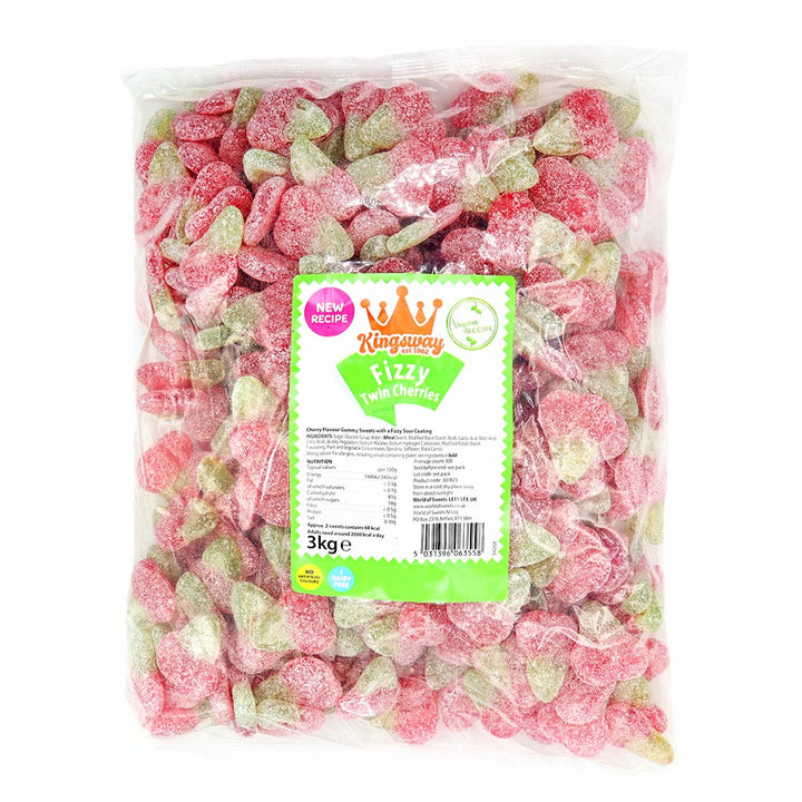 Kingsway FizzyTwin Cherries 3kg are delicious cherry flavoured sweets in the shape of fruit. Juicy, cherry flavour jelly sweets, styled as two cherries together, these red and green sweets are always popular, a colourful option to brighten up your pick and mix stand! Whether from a pick and mix display or another sales format, Fizzy Twin Cherries will soon become a bestseller. Take your pick 'n' mix selection to the next level with Kingsway! From retro classics to innovative new flavours, Kingsway provides the perfect way to create your ultimate sweet range. Don’t miss the Kingsway Pick 'n' Mix Deal to mix, match, and save, or explore the Kingsway Mega Value range for unbeatable prices. Stock up today and expand your product offering with Kingsway.