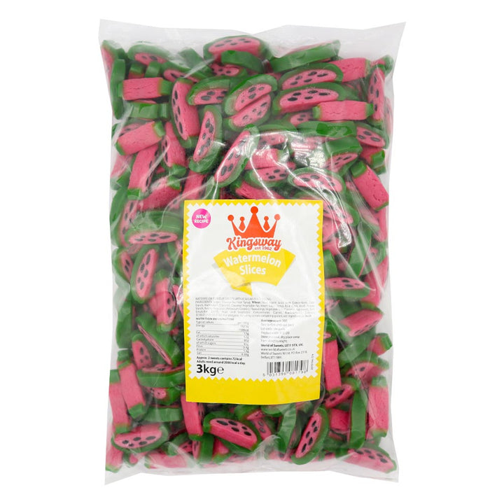 Available in a 3kg bag, these watermelon slices by Kingsway can be decanted straight into your pick and mix bins or why not pair with other fruit like sweets to create a pre-packed fruit medley. Take your pick 'n' mix selection to the next level with Kingsway! From retro classics to innovative new flavours, Kingsway provides the perfect way to create your ultimate sweet range. Don’t miss the Kingsway Pick 'n' Mix Deal to mix, match, and save, or explore the Kingsway Mega Value range for unbeatable prices. Stock up today and expand your product offering with Kingsway.