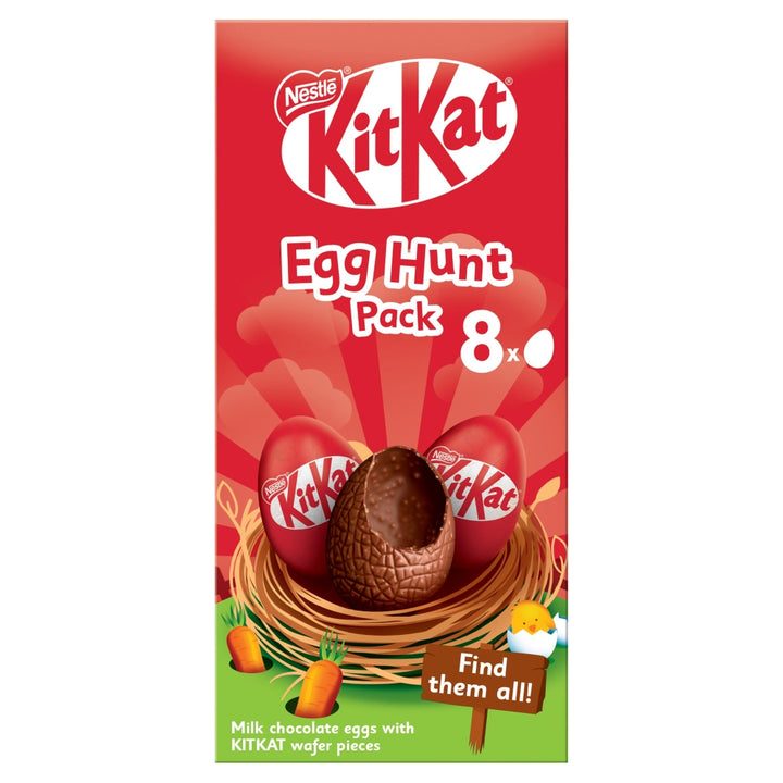 Celebrate your Easter with the KitKat Easter Egg Hunt Pack! 8 individually wrapped Easter eggs, smooth creamy milk chocolate with the well-loved KitKat wafer pieces! KitKat uses sustainably sourced cocoa from the Nestle Cocoa Plan.