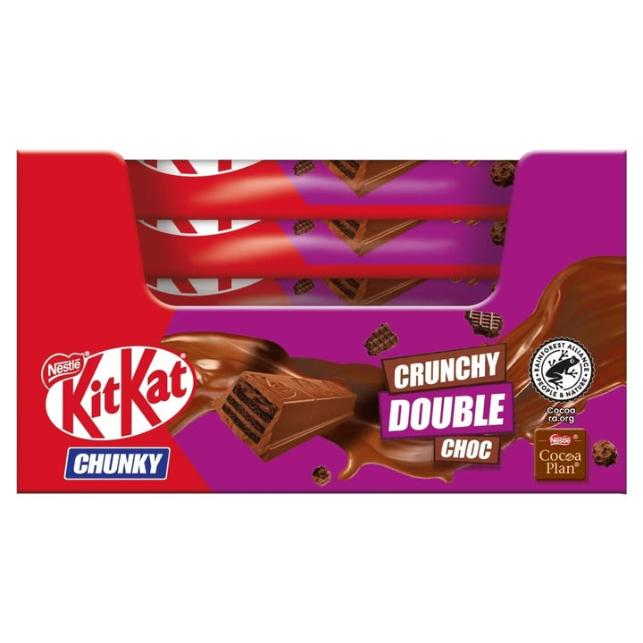 Unwrap, snap off a chunk and enjoy the delicious smooth milk chocolate and crispy wafer of KitKat Chunky Crunchy Double Chocolate. A crispy cocoa wafer with a smooth chocolate topping, covered in a tasty layer of smooth milk chocolate, made with no artificial colours, flavours or preservatives, and suitable for vegetarians A great treat when you are enjoying a break, a KitKat with a bit more bite!