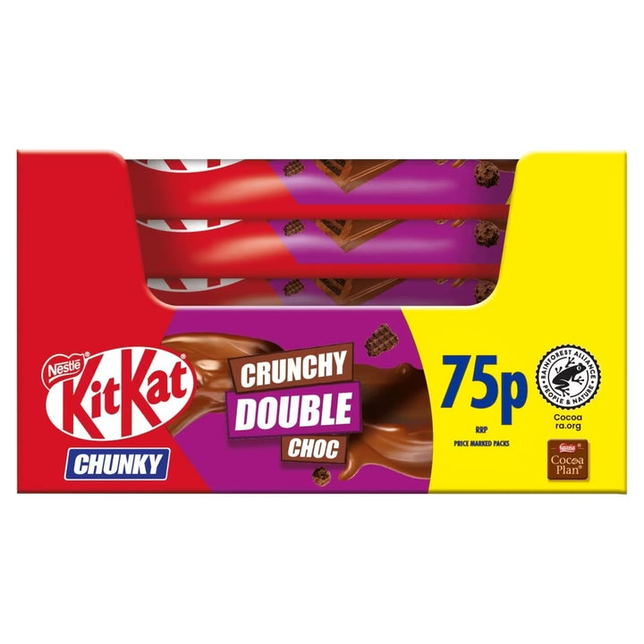 Unwrap, snap off a chunk and enjoy the delicious smooth milk chocolate and crispy wafer of KitKat Chunky Crunchy Double Chocolate. A crispy cocoa wafer with a smooth chocolate topping, covered in a tasty layer of smooth milk chocolate, made with no artificial colours, flavours or preservatives, and suitable for vegetarians A great treat when you are enjoying a break, a KitKat with a bit more bite! Not only are these KitKat bars the perfect chocolate treat, they also offer your customers exceptional value with their 75p price-mark.