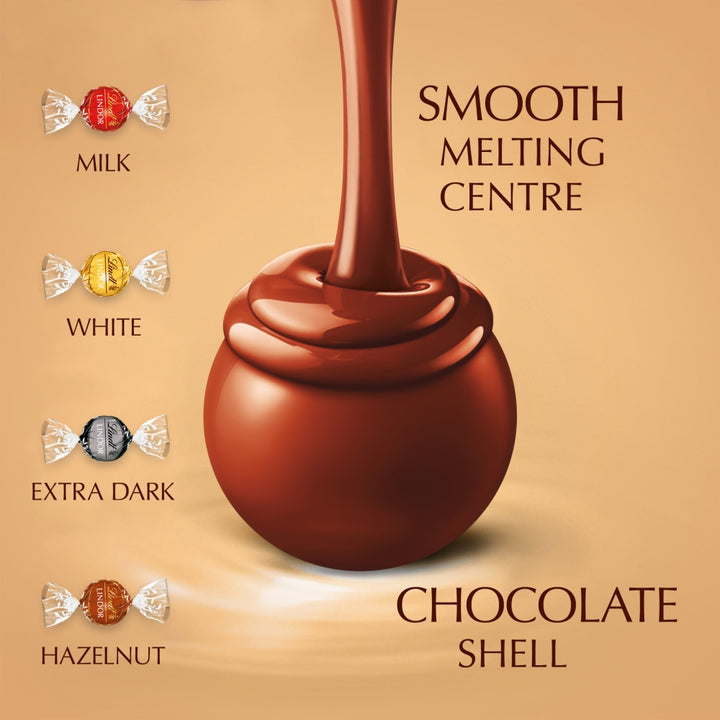 Discover our irresistible selection of classic Milk, sweet White, intense Dark and crunchy Hazelnut chocolates with our Lindor Assorted Chocolate Truffles. Inside this glistening gold box lies luxuriously smooth and delicate chocolate shells hiding irresistibly creamy, melt-in-the-mouth, chocolate centres perfect for treating yourself, or your loved ones.