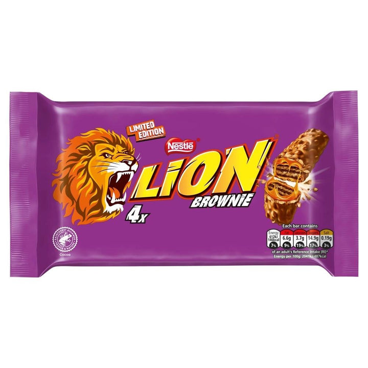 A multipack of 4 delicious limited edition bars of crispy wafer with a brownie flavour filling, chewy caramel, and crunchy cereals covered in smooth milk chocolate, made without artificial colours, flavours or preservatives. Lion bars are known for their rugged appearance and combination of crispy filled wafer, chewy caramel and crunchy cereals covered in smooth milk chocolate, providing a substantial, multi-textural bite across the decades.
