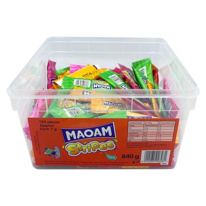 Made by Haribo, Maoam Stripes come individually wrapped and packed into a clear tub so that you can sell them by the piece in a pocket money range of sweets. Fruit flavour, they are an ideal treat for children; soft, chewy and very nice too.