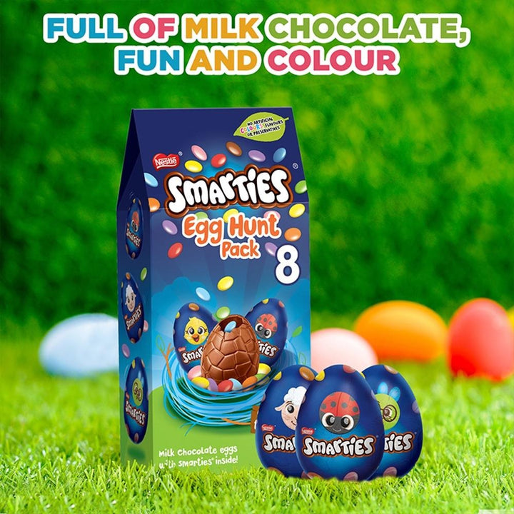 SMARTIES® Egg Hunt Pack contains 8 smooth milk chocolate eggs that contains mini SMARTIES® inside that contains no artificial colours, flavours or preservatives. A novel chocolate treat for Springtime!